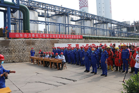 6月29日上午,公司在液氨球罐区组织开展了2022年度生产安全事故综合应急救援演练活动。沂源县应急局党委委员、副局长杨金贵,沂源县经济开发区安环局局长吴明等领导以及我公司100余名员工观摩了演练。