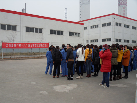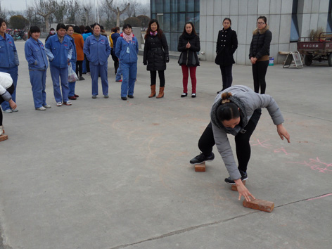 在“三八”国际妇女节到来之际,为丰富节日期间广大女职工的业余文化生活,活跃节日气氛,展现女职工爱岗敬业、健康向上的精神面貌,公司于3月8日上午在办公楼前举办了文体娱乐活动,子公司新泰公司也同时举办了相关庆祝活动,总公司活动现场设置了趣味保龄球、定点套圈、沙包投准、摸石过河等四个项目,共9个代表队68名选手参加了比赛。新泰公司共5个代表队45名参赛选手参加了“ 双脚跳远” “脚扔沙包”及“趣味保龄球”三个项目的比赛,比赛结束后,对获奖人员进行了现场颁奖。(图为比赛现场)